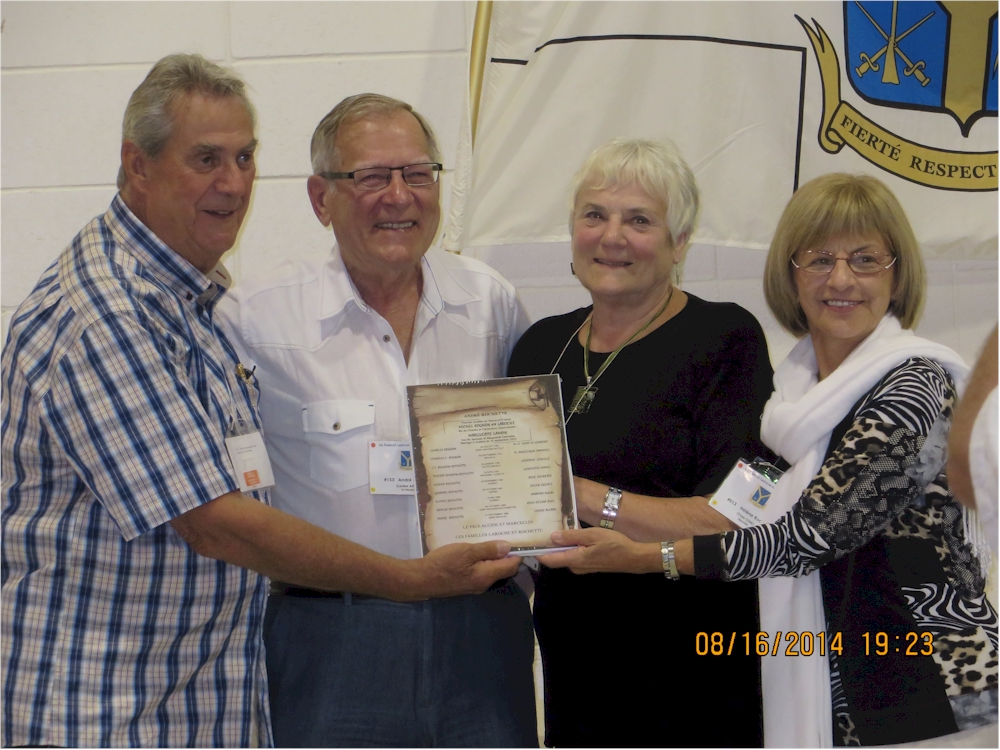 Hommage au récipiendaire du prix Notes rédigées par Gilles Laroche avec la participation de Louise Allard l’épouse d’André. Celui-là nous avons failli l’oublier. Il a été tellement présent dans notre organisation, il a été l’initiateur de plusieurs idées qui ont toujours fait leur chemin jusqu’à l’aboutissement, que nous le prenions pour acquis Mais commençons par le début. Il est né à Québec au tournant des années ’30. Son père le laisse orphelin à l’âge de 18 mois avec un frère et une sœur. La famille déménage alors dans la Beauce, à St-Odilon de Cranbourne. Sa mère exerçait une profession qui reprend, aujourd’hui, ses lettres de noblesse : sage-femme… et sacristine par surcroît. Durant son adolescence, il a été affecté par une maladie qui avait cours durant ces années-là : la tuberculose; il a été hospitalisé durant 4 ans. Ce qui ne l’a pas empêché d’avoir, par la suite, une vie bien remplie. C’est à la Banque Canadienne Nationale qu’il a débuté sa carrière. Ils ne l’ont pas gardé longtemps au Québec, ils l’ont transféré à Toronto. Puis il passe chez Colgate-Palmolive, au département de crédit, comme correspondant bilingue. C’est chez Nalaco qu’il décide finalement de faire carrière comme assureur-vie et cela durera 41 ans. Au gré de ses différents emplois, il a trouvé le tour de faire un peu de tout. Croyez-le ou non, durant ses loisirs il a travaillé comme bedeau à l’Église du Sacré-Cœur à Toronto. Il a chanté dans la chorale «Les Ceintures Flêchées» dont il a été le trésorier. C’est là qu’il a rencontré celle qui devait devenir son épouse. S’étant marié, le couple s’établit à Toronto, lieu de son travail. Leurs trois rejetons sont d’ailleurs nés à Toronto. Depuis, le clan a augmenté puisqu’il est le grand-père de 7 petits-enfants De retour au Québec en 1968, il fonde l’Association du Québec pour Enfants avec Problèmes Auditifs dont il a été président pendant 6 ans. L’organisme existe toujours et rend d’innombrables services aux enfants atteints de surdité aussi bien qu’aux adultes. Il est également actif au sein de la Chambre de Commerce des Jeunes de Montréal. En 1987, il reçoit de l’association des Assureurs-vie de Montréal le prix du Mérite Social. Et en 1988, il reçoit rien de moins que le prix du Bénévolat du Canada. Parlons un peu, maintenant, de son implication au niveau de notre association «Les Familles Laroche et Rochette» dont il devient membre en 1995. Il est élu au conseil d’administration en 1998 où il cumule plusieurs mandats jusqu’en 2010, notamment à titre de Vice-Président. Il est responsable de la préparation et de la publication de notre bulletin trimestriel, le Larochette, pendant une douzaine d’années. Il a dessiné le sigle de la base de données de notre site internet qu’il a contribué à mettre sur pied avec le regretté Robert Turner à la fin des années ’90. C’est après le départ de Robert Turner en 2002, qu’il a recruté notre dévoué webmestre actuel Georges Vaillancourt Il a créé le parchemin en hommage aux membres encore actifs à la fin des années ’90 et qui ont œuvré à la mise sur pied de notre association. Il a développé le dépliant présentant notre association, nos débuts, nos armoiries, notre conseil d’administration. Ce dépliant sert pour le recrutement de nos membres et à nous présenter lors d’évènements publics, tel le Salon des Familles Souches du Québec maintenant appelé le Salon du Patrimoine. Il fait partie du Comité organisateur du rassemblement du 10ième anniversaire de notre association en 1999 à Neuville. En 2000 il fait avancer plusieurs idées dont la création du drapeau de l’association, la création du Prix Alcide et Marcellin dont il a développé la présentation, arbre généalogique et fond de scène, prix que l’on remet chaque année depuis l’an 2000. A sa suggestion, la publication au bulletin d’une chronique nécrologique a également été instaurée à cette période. Et en 2001, c’est la mise sur pied du Club de la Fierté. En 2002 il pousse sur l’idée d’avoir une chronique dans le bulletin mettant à contribution les membres pour trouver des parents aux orphelins de notre banque de données. En 2006, il conçoit la plaque commémorative dédiée à Michel Rognon et Marguerite Lamain, plaque qui a été bénie et installée dans l’Eglise de Neuville lors de notre rassemblement de cette même année. Cette plaque honore l’ancêtre d’une lignée de Laroche et la lignée des Rochette. Si notre association traverse les âges et demeure en santé financière, cette plaque pourrait être la première d’une série d’autres lignées de Laroche dans les paroisses ayant acceuillies l’ancêtre, tel François Laroche à Neuville, Amable Breillard dit Laroche à Batiscan, Jean Laroche à Longueuil et Michel Laroche dit Fontaine à Québec. En 2007, c’est le début de la publication au Larochette de la chronique des anniversaires des membres. En 2008, suite à l’adoption d’un hymne officiel pour notre association, il prend l’initiative du déploiement du drapeau avant la tenue de nos assemblées générales annuelles. Il a aussi des loisirs puisqu’il lui reste un peu de temps libre. Évidemment. il s’intéresse à la généalogie. Il aime bien la lecture. Il aime bien les mots-croisés. Ce qu’il ne déteste pas non plus, de même que sa compagne de toujours, ce sont les voyages. Anecdote amusante qui vous permettra sûrement de reconnaître le récipiendaire du Prix Alcide et Marcellin de 2014 : Il a personnifié notre ancêtre Michel Rognon au 10ième anniversaire de notre association à Neuville avec Diane Rochette dans le rôle de Marguerite Lamain. Lors du 25ième rassemblement à St-Augustin et Neuville en 2013, il a répété le geste, cette fois avec sa fille Christine. Un dernier 